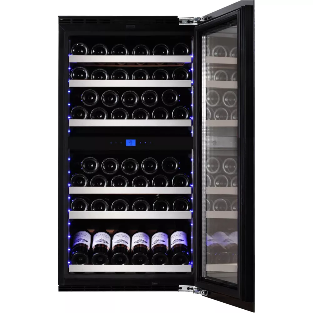 • Type de porte : vitrée, permet de visualiser facilement les bouteilles sans avoir à ouvrir la porte, ce qui réduit la circulation de l’air dans la cave et donc la variation de la température. Le traitement anti-uv protège le contenu.