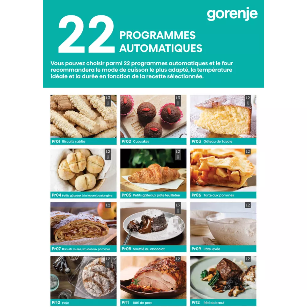 Vous aurez de quoi laisser votre créativité s’exprimer en choisissant le Four Pyrolyse GORENJE BPSA6747A08BG. Grâce à ses 22 programmes automatiques, vous couvrirez tout un ensemble de recettes sans aucun effort. Ces recettes pré-enregistrées comportent notamment un mode pizza qui montera à 300°C en seulement 6 minutes.