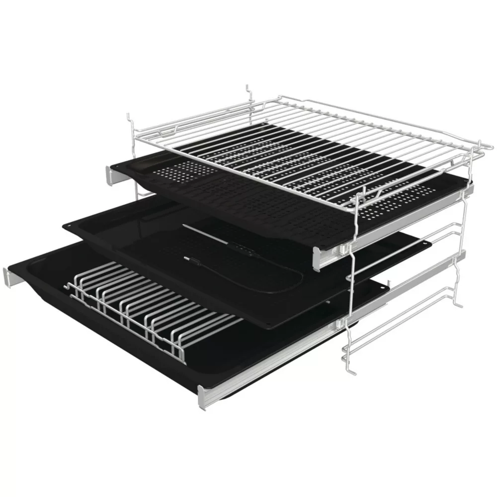 - Rails téléscopiques : ils permettent d’accéder à vos plats en les faisant coulisser en dehors de l’enceinte de cuisson en évitant les risques de basculement. Vous pourrez arroser confortablement votre rôti ou retourner facilement vos plats sans risque de brûlure.
