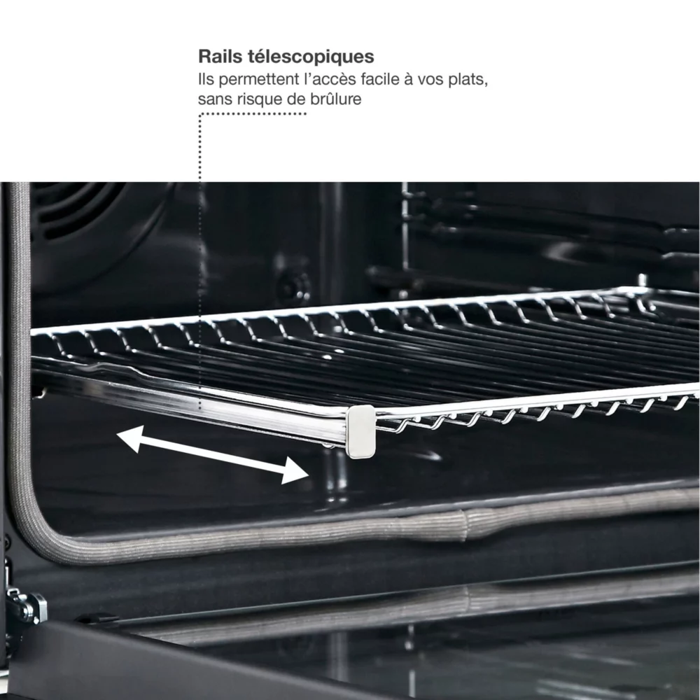 • Rails téléscopiques : ils permettent d’accéder à vos plats en les faisant coulisser en dehors de l’enceinte de cuisson en évitant les risques de basculement. Vous pourrez arroser confortablement votre rôti ou retourner facilement vos plats sans risque de brûlure.