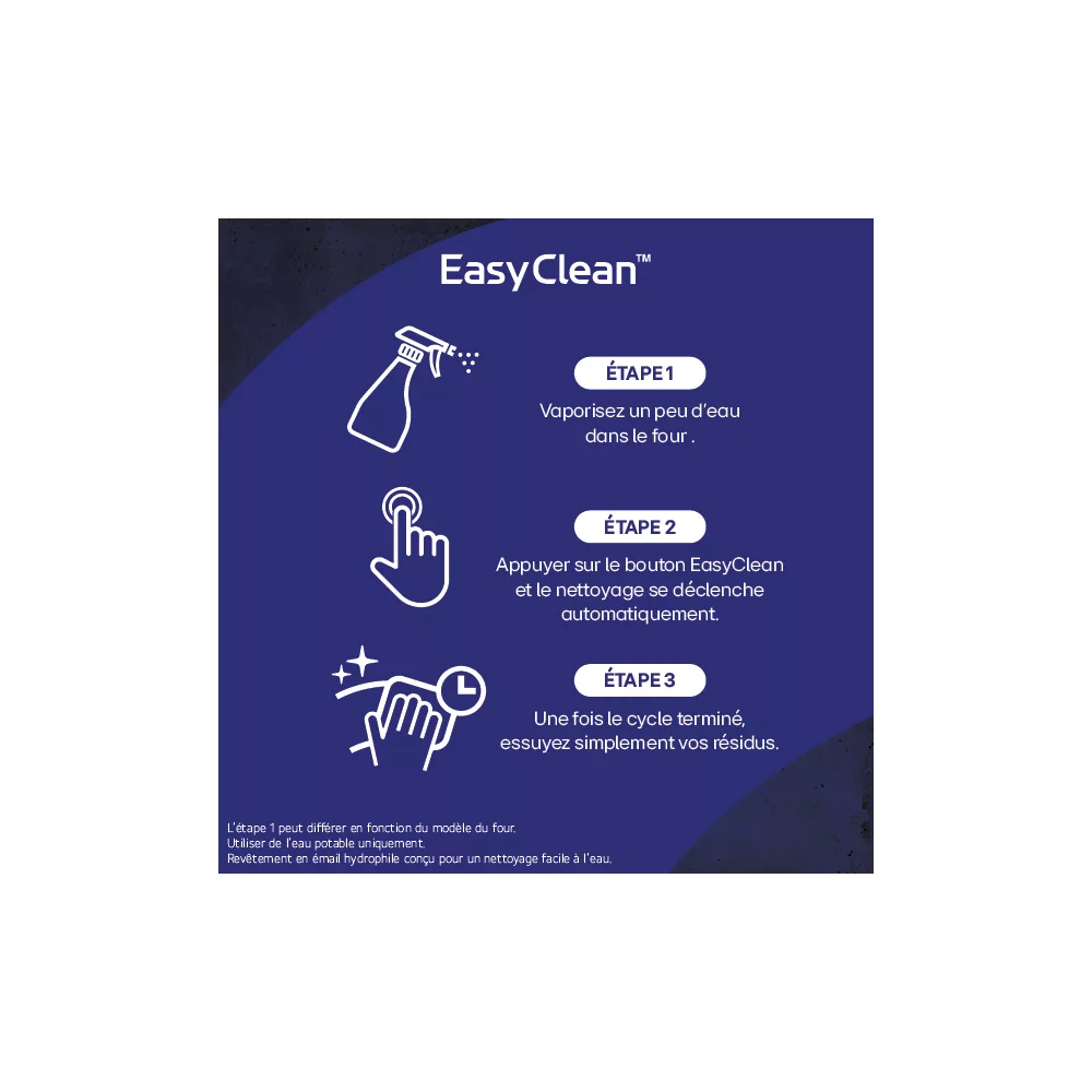 • Avantage vapeur (hydrolyse) : Il suffit de verser au fond la cavité de l’eau et du liquide vaisselle. Le four chauffe quelques minutes, l’eau se transforme en vapeur et ramollit les graisses. Un coup d’éponge pour retirer les résidus tombés dans la cavité. Ce système est écologique et économique.