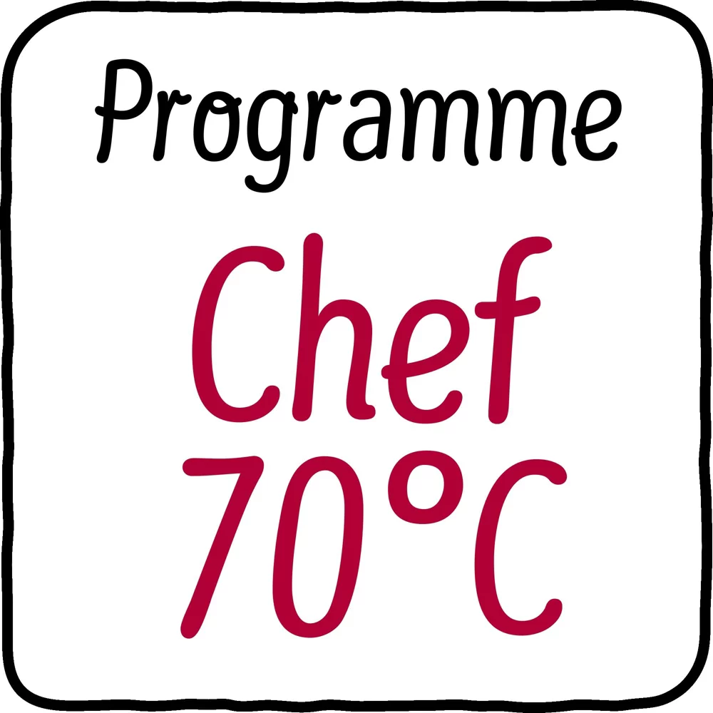 - Détails des programmes et températures : Eco 50 °C, Auto 45-65 °C, Chef 70 °C, Classic 60 °C, Verre 40 °C, Favourite
