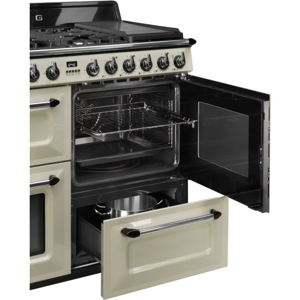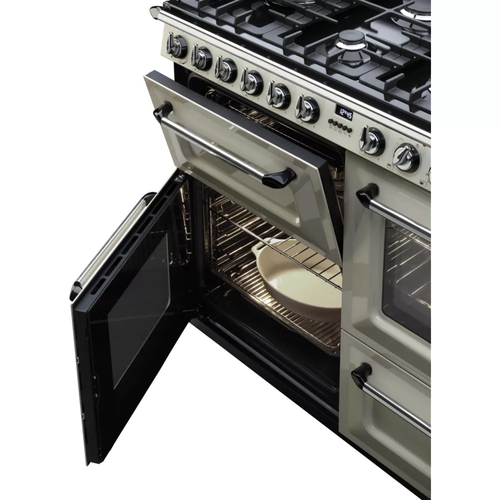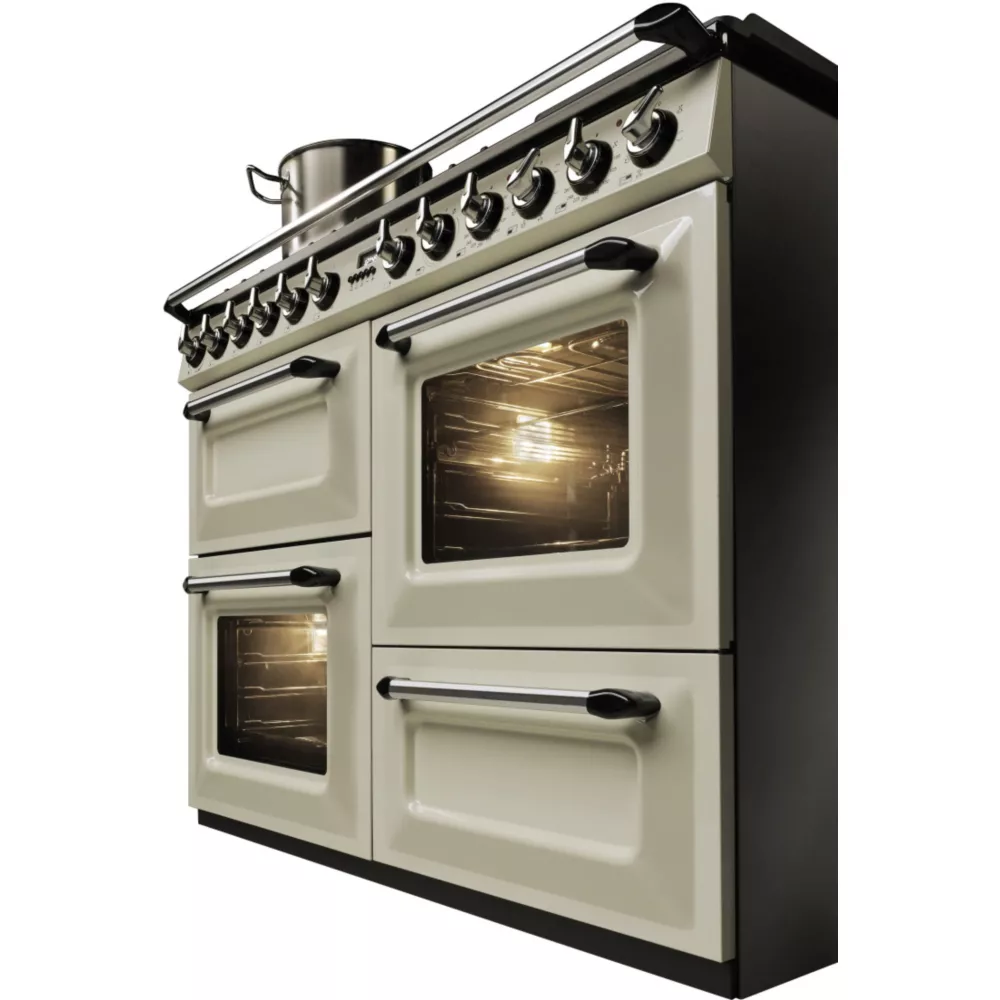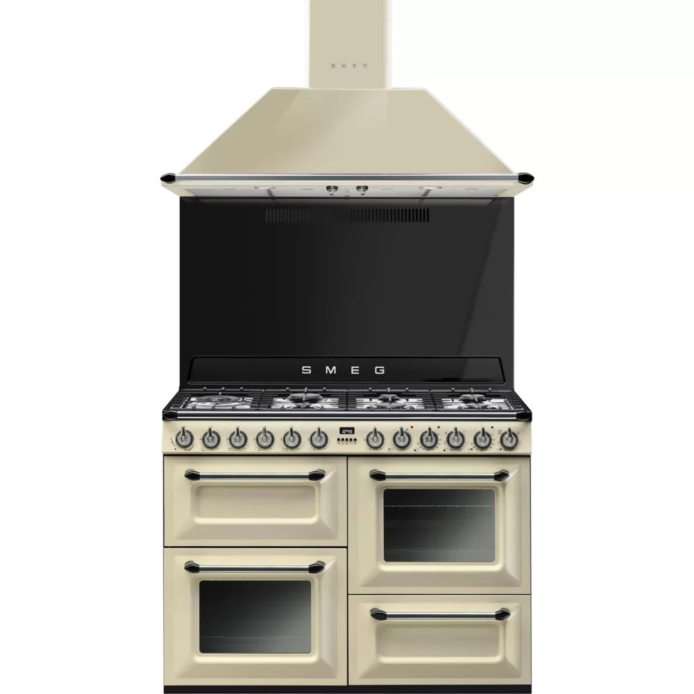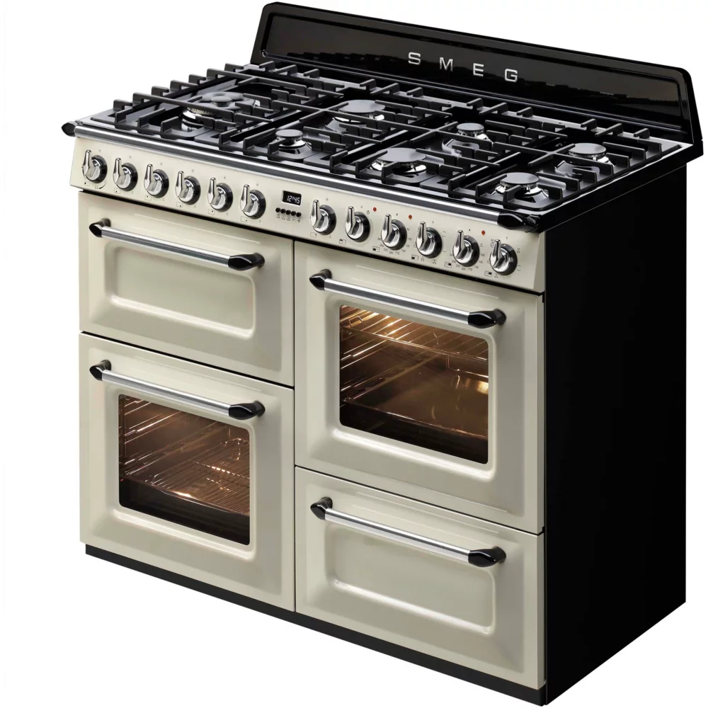 Le piano de cuisson SMEG TR 4110 concentre toutes les fonctions d’une cuisinière classique avec un grand choix de modalités de cuisson qui s’adaptent à vos besoins spécifiques dans un meuble compact: ses 7 foyers à gaz, de puissance progressive de 1000 à 4200 watts, vous permettent de cuisiner plusieurs plats simultanément ou des plats complexes qui demandent des cuissons séparées sans devoir attendre. Son four électrique présente trois cavités, de 36 litres et deux fois 63 litres de contenance, munies de lumière interne. Leur puissance varie de 50 à 300 degrés et un grill d’une puissance de 2700 watts, suivant différentes modalité ventilées ou non: statique ventilé, sole, grill et décongélation.